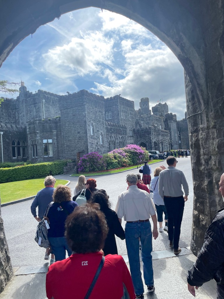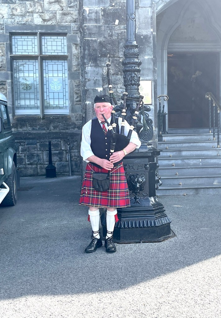 After that, we proceeded to drive through what Oscar Wilde called the “savage beauty” of Connemara, which is a region of bogs, heathland, mountains and shimmering lakes — This is part of the “Wild Atlantic Way”. Finally, we arrived at Ashford Castle where we will spend the next two nights. We were met by an Irish piper!
