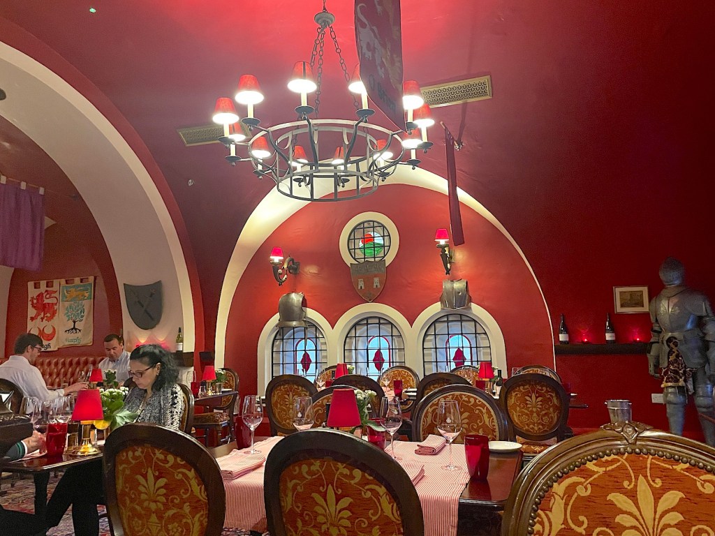 The Castle has three restaurants. The first photo below is the “Cottage” where we thought we had reservations for our first night. We were wrong, and they sent a driver to bring us back to where we belonged — the Dungeon! We enjoyed it so much, we returned for the second night’s dinner also!