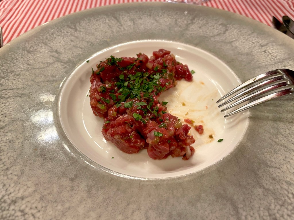 The dish was steak tartare, prepared at the table.