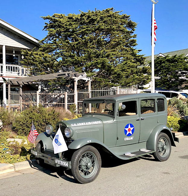Jay is a veteran of the Air Force, but – of course – the “Air Force” didn’t exist in 1931; it was the US Army Air Corps. Normally a staff car would be used by a general and the general’s flag would be displayed at the front of the car. Maxi displays Jay’s own rank (Senior Airman) when he was in the service.