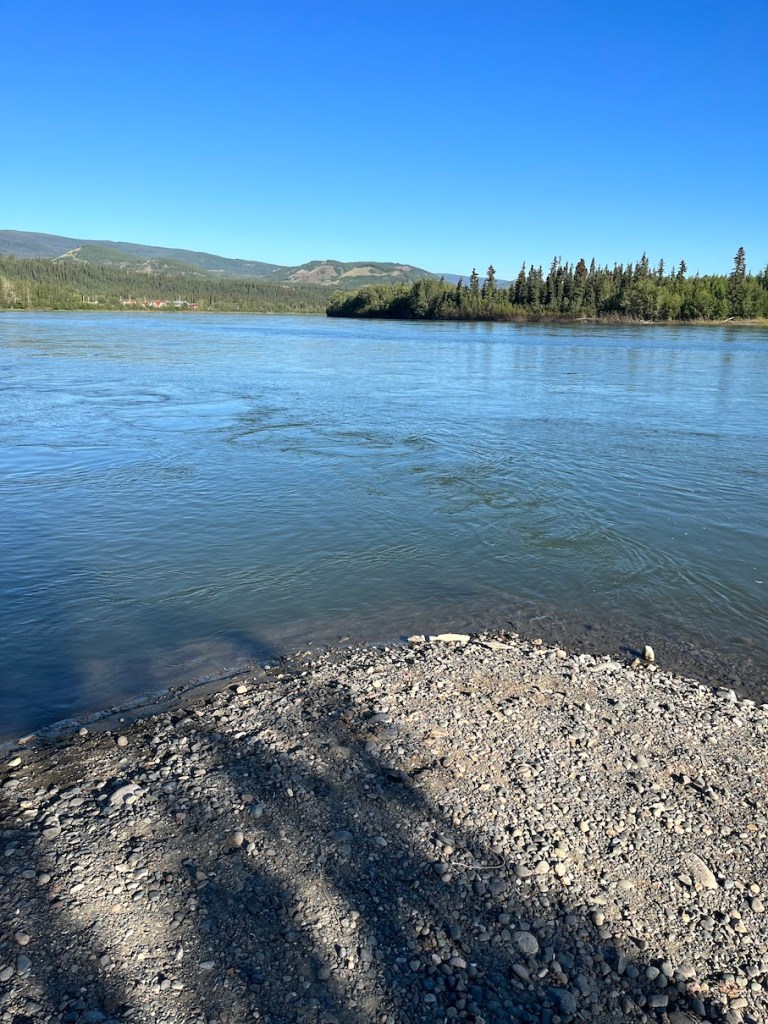 Just in case you’ve forgotten how beautiful this country is, here’s one more photo from Carmacks early in the morning of July 7. This was the view from the guys’ cabin, taken 100 feet from where they had spent the night: