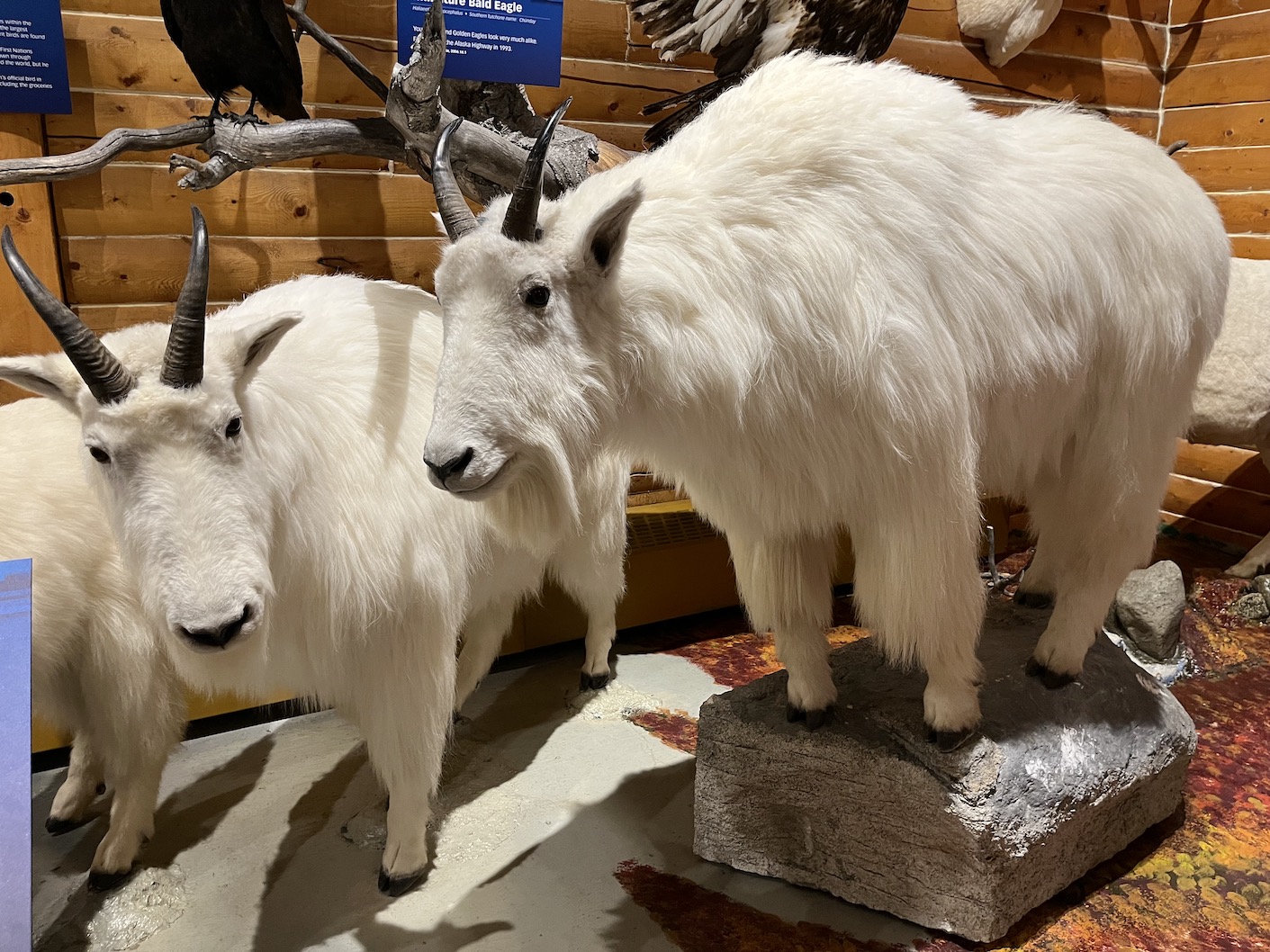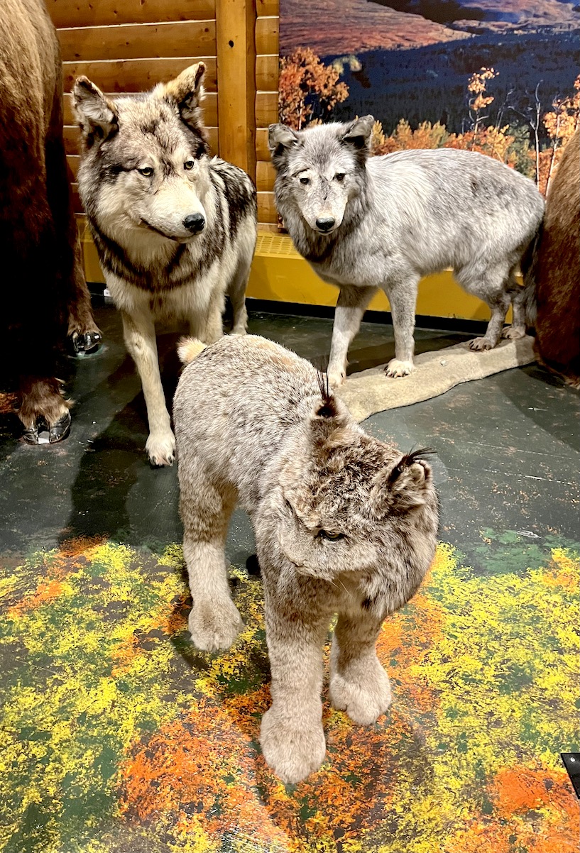 Moving gradually toward home, the guys discovered the McBride Museum in Whitehorse (as we now know, the capital of the Yukon territory.) The seat below was carved from a Yukon Tree, which we’ll talk about tomorrow, and the rest of the photos are examples of Yukon wildlife: